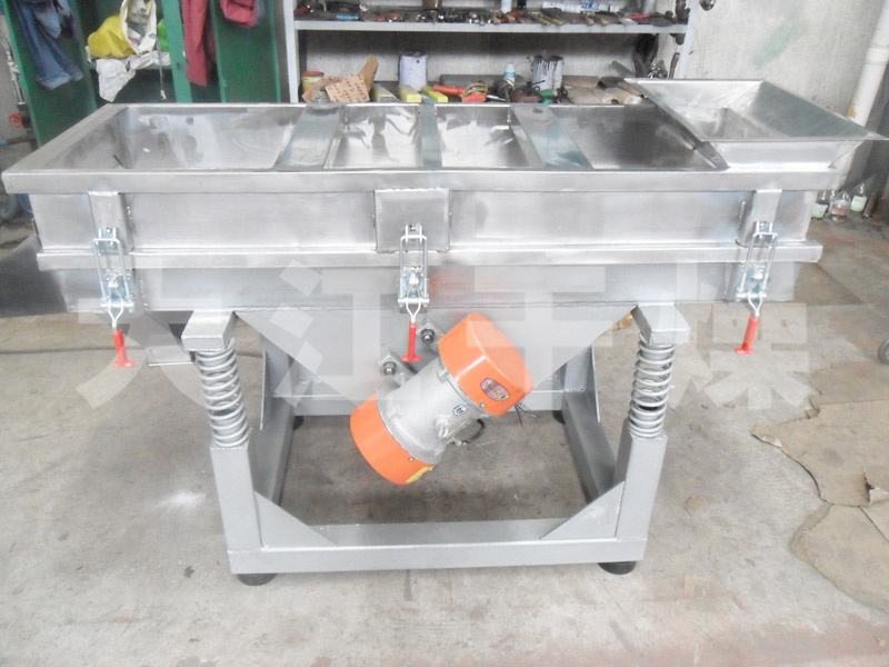 本机上部采用快拆式手柄,把整机连成一个整体,上盖全密封、有效防止物料在过筛时由于振动而产生粉尘飞扬。筛体下部安装振动电机,有效保证了物料的结构紧凑,下部采用弹簧减振,使整机在平稳状态下工作。下面底座采用可调式,可调节正在过筛时的筛面倾斜角度,根据物料特性以取得过筛效果。