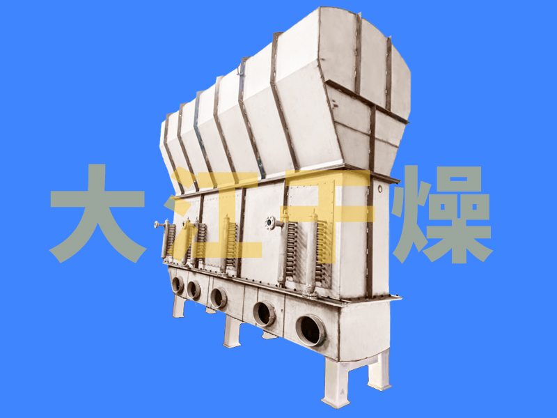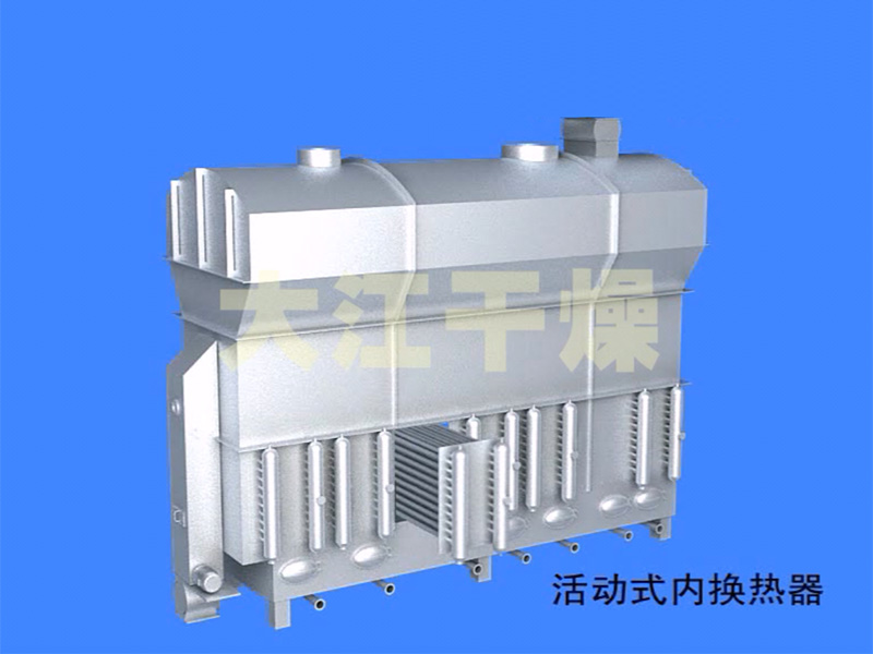 湿物料小苏打由前段工序设备输入,经预混后在布料器的分散作用下均匀落入埋管流化床,由120℃的热空气使其产生正常的流态化,由热风和埋管流化床内置式换热器共同提供热量,使水份蒸发,其含湿量降为0.1%后经出料口排出,然后由输送机送入冷却床,由除湿后的冷却风使其保持流态化,由冷却风和埋管流化床内置式换热器共同提供冷量,使物料降温,降温后的物料排出冷却流化床。