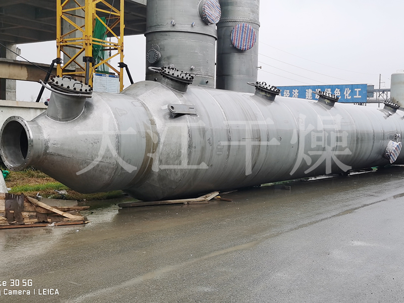 离开埋管流化床的带湿度和粉尘CO2经管道进入旋风除尘器,CO2夹带的大部分物料被搜集下来排出旋风除尘器进入预混器,经初步除尘后的CO2进入洗涤塔进行二次除尘后,进入冷凝塔,塔内将CO2温度降低,将尾气中的水分冷凝下来。冷凝后的CO2排出冷凝塔,经除雾器后由循环风机提供动力在干燥系统内循环使用。